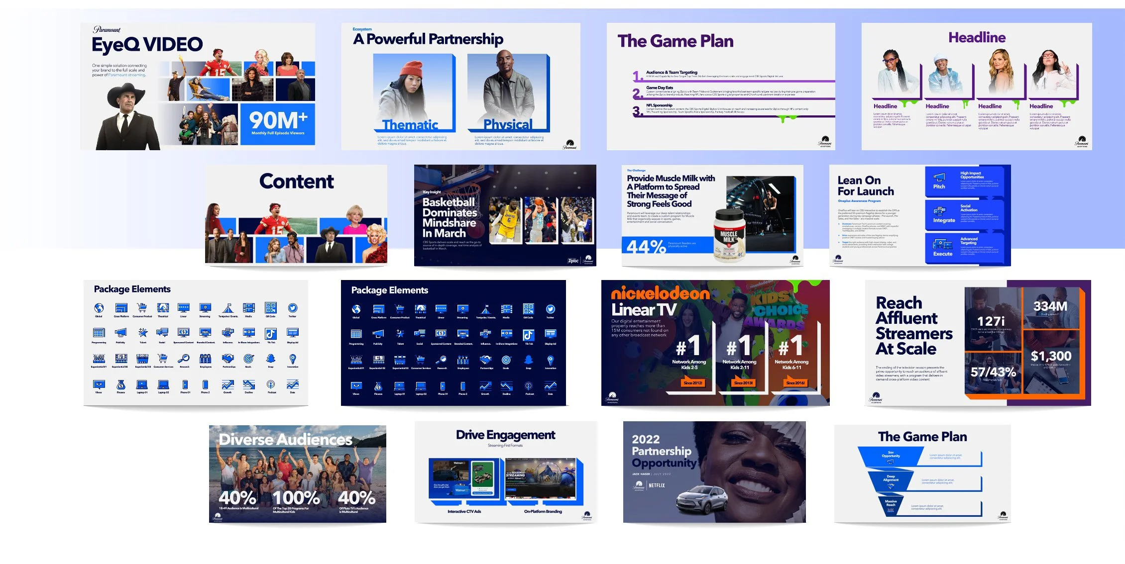 CHALLENGE: In 2016, a rapidly changing media landscape, it became apparent that CBS/Paramount’s sales-facing decks, emails and communications had subpar design attention paid to them, when compared to competitors. As we were in heated competition for market/revenue share, this took on increased importance especially as media buyers were compiling all potential partners in one master deck to review. We needed to not only stand out, but ensure that: